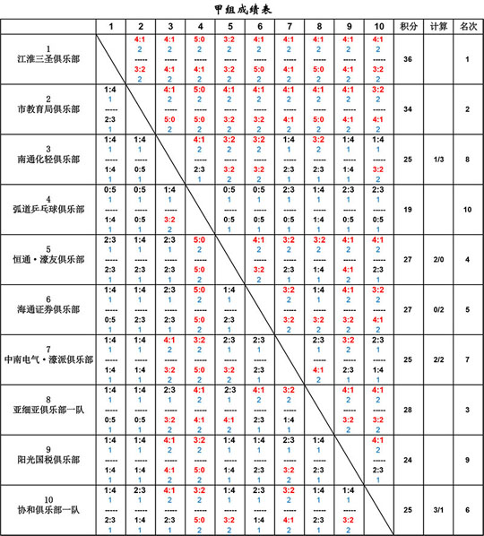 截止2013年12月15日,2013年南通市第五屆"城市嘉苑杯"乒乓球俱樂部聯(lián)賽完成了甲組、乙組、丙組的全部比賽,甲組成績公告如下: