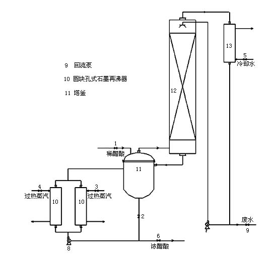 本系統(tǒng)采用先進設(shè)計理念,將生產(chǎn)過程產(chǎn)生的15%-25%的稀醋酸濃縮到99%,在此過程中使排放的廢水達到環(huán)保標(biāo)準(zhǔn)。系統(tǒng)主體設(shè)備-石墨精餾塔,采用聚四氟乙烯浸漬石墨新型材料制造,整個系統(tǒng)具有工藝先進,操作簡便,運行費用少,使用年限長的特點,目前,該系統(tǒng)已在浙江龍盛集團、浙江閏土集團成功運行。